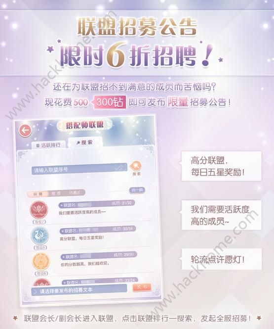 4月27日5:00—5月1日 23:59,联盟招募公告限时6折发布!原价500钻的招募公告,活动期内花费300钻即可进行招募~