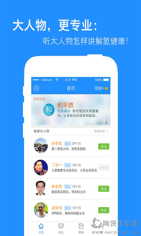 版本:v2.1 时间:2016-1-261、新增健康大人物:让大人物带你认识氢健康;