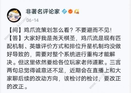 主要这个鸡爪流是现有匹配机制的漏洞,没有做好相互的制约制衡关系导致,这个确实需要将整个系统进行重构才可,不然的话,鸡爪流会一直盛行,非常影响玩家们的游戏体验,有些玩家想要正常上分,有些玩家则要通过鸡爪流进行上分,相互之间也是存在矛盾,用鸡爪流的玩家们也会越来越多,整个匹配圈都会混乱的哦!说不定人人都是鸡爪。